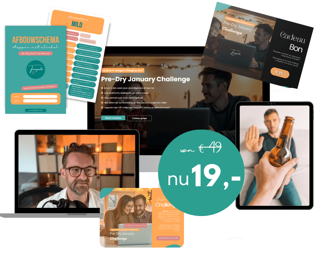 De challenge loopt acht dagen van 27 december t/m 3 januari en helpt je stap voor stap je alcoholgebruik veilig te verminderen met een persoonlijk afbouwschema. Elke dag ontvang je een korte videoles met uitleg, motivatie en praktische strategieën (triggerherkenning, craving‑coping, sociale vaardigheden, gezonde routines en terugvalpreventie). Het 8-daagse programma is bedoeld voor lichte tot milde drinkers; bij zwaarder gebruik krijg je een aangepast tweeweken‑afbouwschema en advies om eventueel eerst medisch overleg te plegen. Je hebt alleen motivatie, een internetverbinding en ongeveer een uur per dag nodig. Wie kiest voor de VIP‑upgrade kan elke avond live meedoen aan Q&A‑sessies met ervaringsdeskundige Robbert en krijgt extra bonussen. Het doel: in acht dagen meer controle, betere slaap en energie, en een zelfverzekerde start van Dry January of een blijvende gedragsverandering.